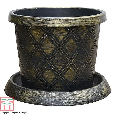- Plastic Flowerpot with Saucer in Black & Gold – Coming complete with a matching saucer, this elegant patio pot features a stylish diamond-trellis pattern in burnished gold. Made from durable plastic, it is lightweight and easily moved around the garden. The weatherproof material makes it suitable for year-round displays of patio shrubs or seasonal bedding plants. The base of the planter features pre-drilled drainage holes to allow excess water to escape. This versatile container is deal for a wide range of plants, and suits both traditional and contemporary garden styles. Height: 30cm (12″). Diameter: 39cm (16″).