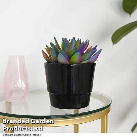 This painted Echeveria makes a fun feature for shelves, windowsills or tables. Echeveria ‘Miranda Chameleon’ forms a neat, architectural rosette of fleshy leaves which have been dyed in a shimmering, metallic paint that reflects a different colour from every angle. In summer it throws up long stems topped with starry, pink flowers. An easy, drought-tolerant houseplant that only needs occasional watering and looks great all year round. Maximum height and spread: 10-20cm (4-8in).