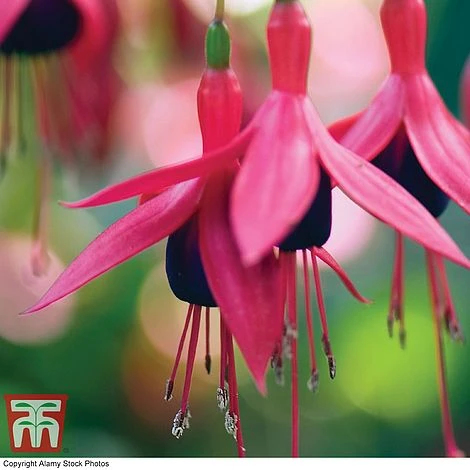 Fuchsia ‘Riccartonii’ is hardy variety that will return year after year. In summer the branching stems drip with single blooms that boast dark purple petals and scarlet outer sepals. This is large Fuchsia that makes a fine focal point at the back of a sunny or partially shaded border. Awarded an RHS AGM for its superb garden performance, this impressive variety has a long flowering period and un upright, bushy habit. Height: 3m (10’). Spread: 2m (6’, 6”).