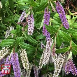 This upright, evergreen shrub boasts a dense covering of glossy foliage all year round. The young leaves are a rich, purple colour, changing to dark green as they mature. Throughout the summer, Hebe ‘Midsummer Beauty’ is covered with short, lilac-purple flower spikes, attracting bees and butterflies to the garden. Low maintenance and easy to grow, this hardy shrub offers excellent year round colour and structure in the garden. Perfect for free draining soils in sunny borders and containers. Hebes cope well with coastal locations and make a great choice for a wildlife garden. Height: 200cm (78″). Spread: 150cm (59″).