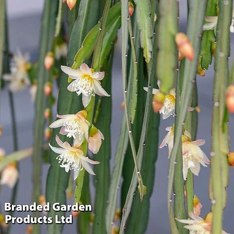Native to the Bolivian rainforest, where it grows on trees and rocks, Lepismium bolivianum is an intriguing spine-free trailing cactus. This unusual houseplant forms a cascade of flat, fleshy foliage that tumbles over the side of its hanging pot, and may bear pinkish white flowers. Forest cactus is very easy to care for, packing a tropical punch for little effort. Height: 120cm (47in). Spread: 30cm (12in).