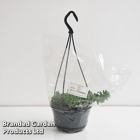 The plump, fleshy leaves of this wonderful succulent form thick strands which dangle over the edge of pots and in time this plant can develop into a truly impressive specimen. Sedum morganianum ‘Burrito’ looks fabulous in a hanging pot, where it can show off its donkey tails of blue-green foliage with a powdery white bloom to best advantage. It occasionally produces small star-shaped flowers from stem tips in summer. Height: 20cm (8in) Spread: 50cm (20in).