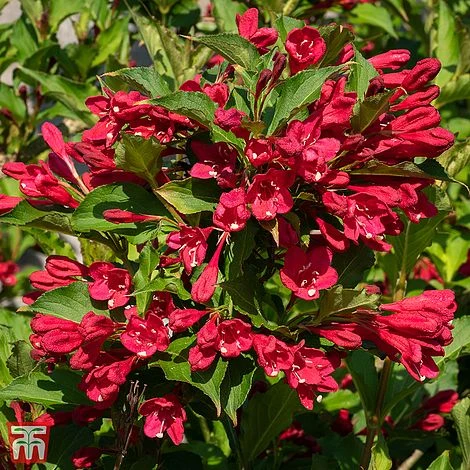 Weigela ‘Nain Rouge’ has a dwarf rounded habit with gently cascading branches that are covered in bloom from May to June. The bright red tubular flowers stand out beautifully against the dense, dark green foliage. As summer ends, this dwarf deciduous shrub turns to autumn shades of red and orange in a final burst of colour. Compact and easy to grow in containers, borders or at the edge of woodland plantings. Height and spread: 90cm (36″).